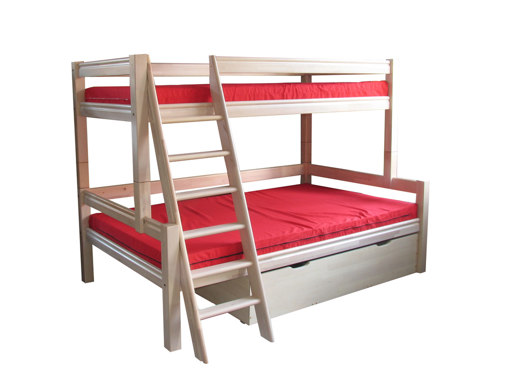 Klasiska tipa divstāvīga bērza masīvkoka gulta ar paplatinātu apakšējo daļu, paredzēta gan bērniem, gan pieaugušiem.