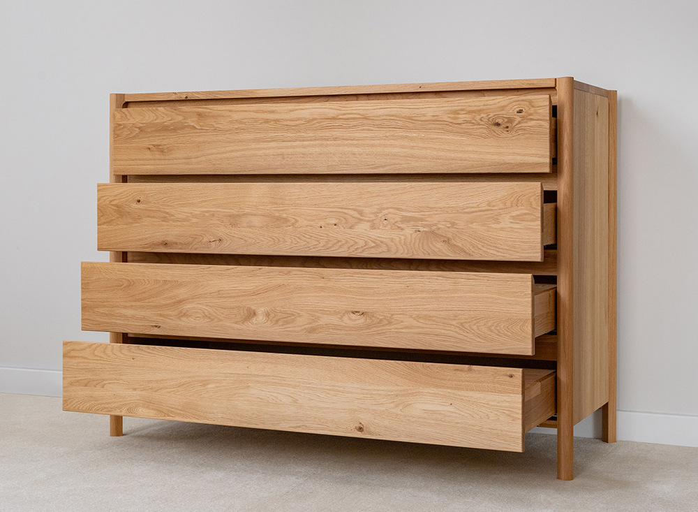 Этот дубовый комод с четырьмя ящиками обеспечивает достаточно места для хранения различных вещей. Вместительные ящики полной глубины отлично подходят для хранения одежды, текстиля, документов или аксессуаров.